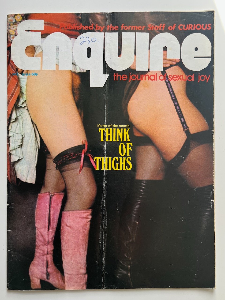 Original vintage issue of Enquire The Journal of Sexual Joy No 1. This is a genuine printed magazine from the period, offered as a collectible item. Vintage publications such as this are increasingly sought after by collectors for their rarity and place in print history. Condition: Fair. Late 1970s. Published by the former staff of Curious magazine. The magazine is worn and been folded down the middle, there is also biro pen on the cover. Format: Printed magazine. Dispatched securely and discreetly.