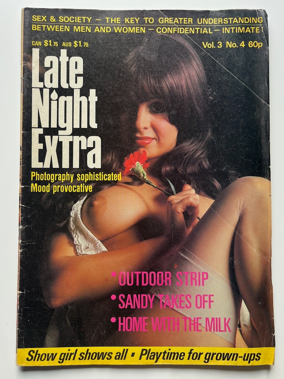 Original vintage issue of Late Night Extra Vol 3 No 4. This is a genuine printed magazine from the period, offered as a collectible item. Vintage publications such as this are increasingly sought after by collectors for their rarity and place in print history. Condition: Good. Some wear to the spine and back cover has a tear. Format: Printed magazine. Dispatched securely and discreetly.